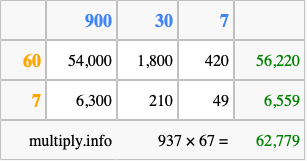 That's all there is to it! As you can see from the box above, the answer to 937 times 67 using the box method is 62,779.