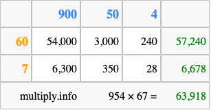 Finally, we add up all the sums we found in step 3 to get our final answer to 954 times 67.