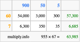 Below is an illustration showing you how to calculate 955 times 67 using the box method, using the instructions above.