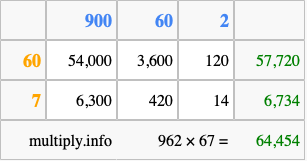 Finally, we add up all the sums we found in step 3 to get our final answer to 962 times 67.