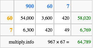 That's all there is to it! As you can see from the box above, the answer to 967 times 67 using the box method is 64,789.
