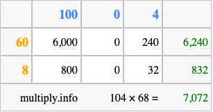Finally, we add up all the sums we found in step 3 to get our final answer to 104 times 68.