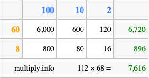 Finally, we add up all the sums we found in step 3 to get our final answer to 112 times 68.