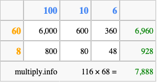 That's all there is to it! As you can see from the box above, the answer to 116 times 68 using the box method is 7,888.