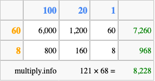 That's all there is to it! As you can see from the box above, the answer to 121 times 68 using the box method is 8,228.