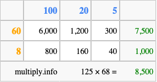 Finally, we add up all the sums we found in step 3 to get our final answer to 125 times 68.