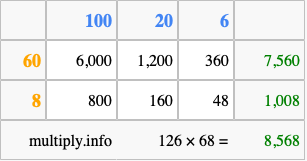 That's all there is to it! As you can see from the box above, the answer to 126 times 68 using the box method is 8,568.