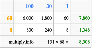 Finally, we add up all the sums we found in step 3 to get our final answer to 131 times 68.