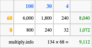 Finally, we add up all the sums we found in step 3 to get our final answer to 134 times 68.