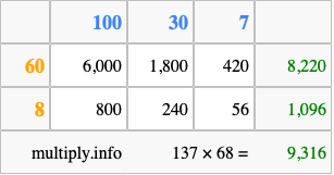 Below is an illustration showing you how to calculate 137 times 68 using the box method, using the instructions above.