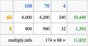 That's all there is to it! As you can see from the box above, the answer to 174 times 68 using the box method is 11,832.
