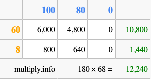 That's all there is to it! As you can see from the box above, the answer to 180 times 68 using the box method is 12,240.