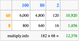 Finally, we add up all the sums we found in step 3 to get our final answer to 182 times 68.