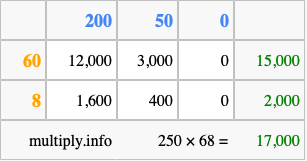 Below is an illustration showing you how to calculate 250 times 68 using the box method, using the instructions above.