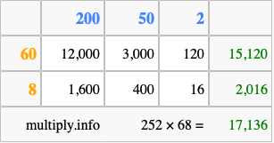 Finally, we add up all the sums we found in step 3 to get our final answer to 252 times 68.
