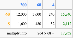 Finally, we add up all the sums we found in step 3 to get our final answer to 264 times 68.