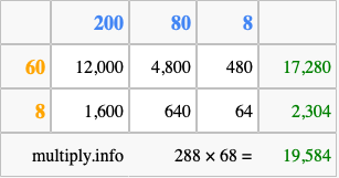 Finally, we add up all the sums we found in step 3 to get our final answer to 288 times 68.
