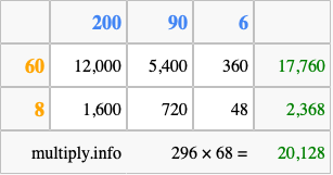 That's all there is to it! As you can see from the box above, the answer to 296 times 68 using the box method is 20,128.