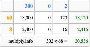 Finally, we add up all the sums we found in step 3 to get our final answer to 302 times 68.