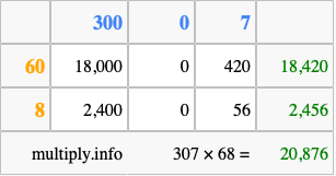 That's all there is to it! As you can see from the box above, the answer to 307 times 68 using the box method is 20,876.