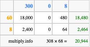 That's all there is to it! As you can see from the box above, the answer to 308 times 68 using the box method is 20,944.