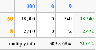 Below is an illustration showing you how to calculate 309 times 68 using the box method, using the instructions above.