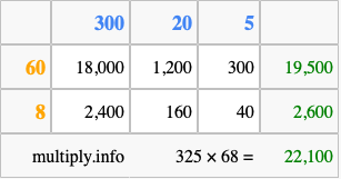 Finally, we add up all the sums we found in step 3 to get our final answer to 325 times 68.