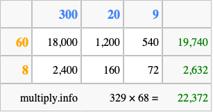 Below is an illustration showing you how to calculate 329 times 68 using the box method, using the instructions above.