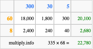 Finally, we add up all the sums we found in step 3 to get our final answer to 335 times 68.