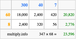 Finally, we add up all the sums we found in step 3 to get our final answer to 347 times 68.