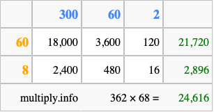 Finally, we add up all the sums we found in step 3 to get our final answer to 362 times 68.