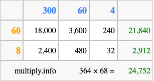 Finally, we add up all the sums we found in step 3 to get our final answer to 364 times 68.