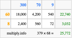 Finally, we add up all the sums we found in step 3 to get our final answer to 379 times 68.