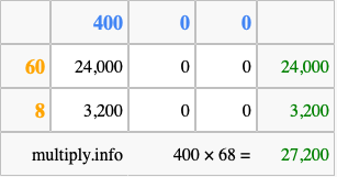 That's all there is to it! As you can see from the box above, the answer to 400 times 68 using the box method is 27,200.