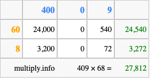 That's all there is to it! As you can see from the box above, the answer to 409 times 68 using the box method is 27,812.