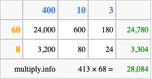 Finally, we add up all the sums we found in step 3 to get our final answer to 413 times 68.