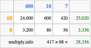 Below is an illustration showing you how to calculate 417 times 68 using the box method, using the instructions above.