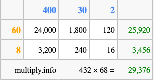 Finally, we add up all the sums we found in step 3 to get our final answer to 432 times 68.