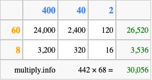 Finally, we add up all the sums we found in step 3 to get our final answer to 442 times 68.