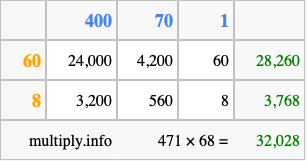 That's all there is to it! As you can see from the box above, the answer to 471 times 68 using the box method is 32,028.