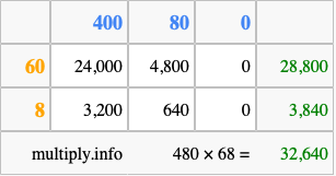Finally, we add up all the sums we found in step 3 to get our final answer to 480 times 68.