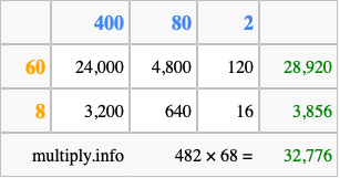 Finally, we add up all the sums we found in step 3 to get our final answer to 482 times 68.