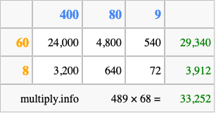 That's all there is to it! As you can see from the box above, the answer to 489 times 68 using the box method is 33,252.