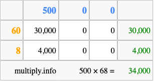 That's all there is to it! As you can see from the box above, the answer to 500 times 68 using the box method is 34,000.