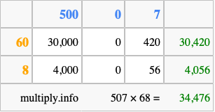 Below is an illustration showing you how to calculate 507 times 68 using the box method, using the instructions above.