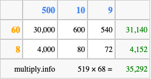 Below is an illustration showing you how to calculate 519 times 68 using the box method, using the instructions above.
