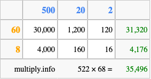 That's all there is to it! As you can see from the box above, the answer to 522 times 68 using the box method is 35,496.