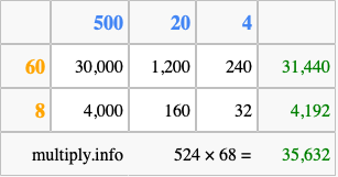 Below is an illustration showing you how to calculate 524 times 68 using the box method, using the instructions above.