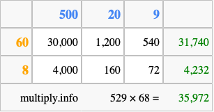 That's all there is to it! As you can see from the box above, the answer to 529 times 68 using the box method is 35,972.