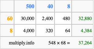 That's all there is to it! As you can see from the box above, the answer to 548 times 68 using the box method is 37,264.
